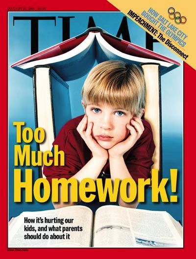 (1999年,时代周刊封面上写道:“功课太多!它们正在伤害着我们的孩子,父母对此应该怎么做呢?”)