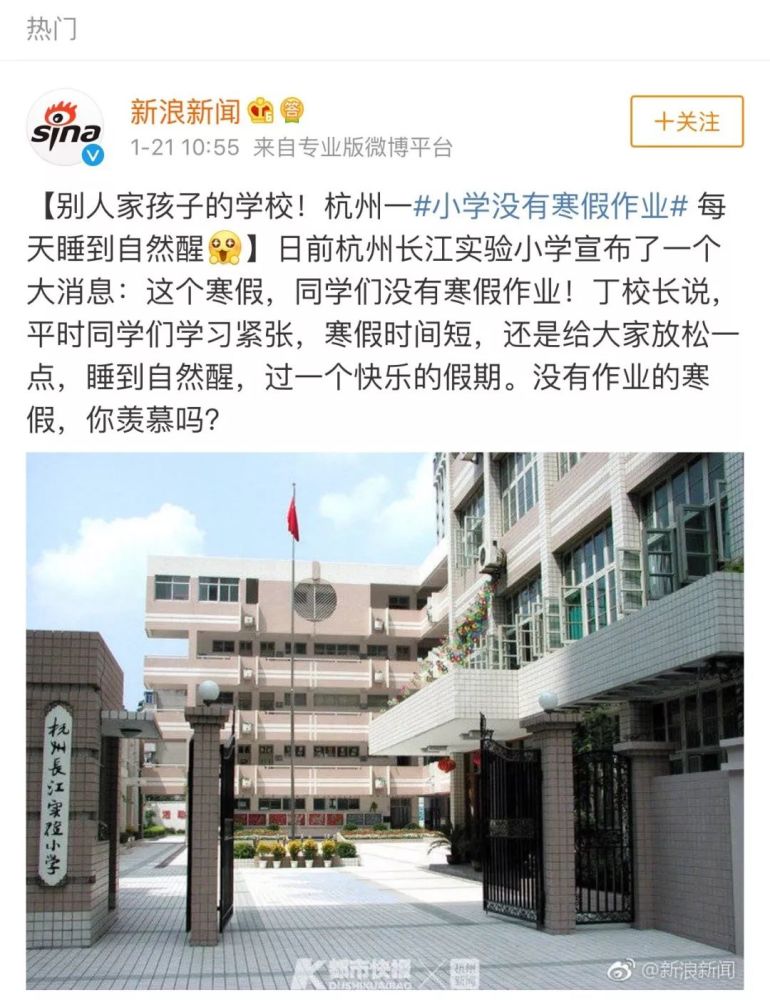 近日,杭州市长江实验小学宣布取消学生寒假书面作业,学校认为,本来寒假时间就短,再加上平时学习紧张,应当适当放松下。
