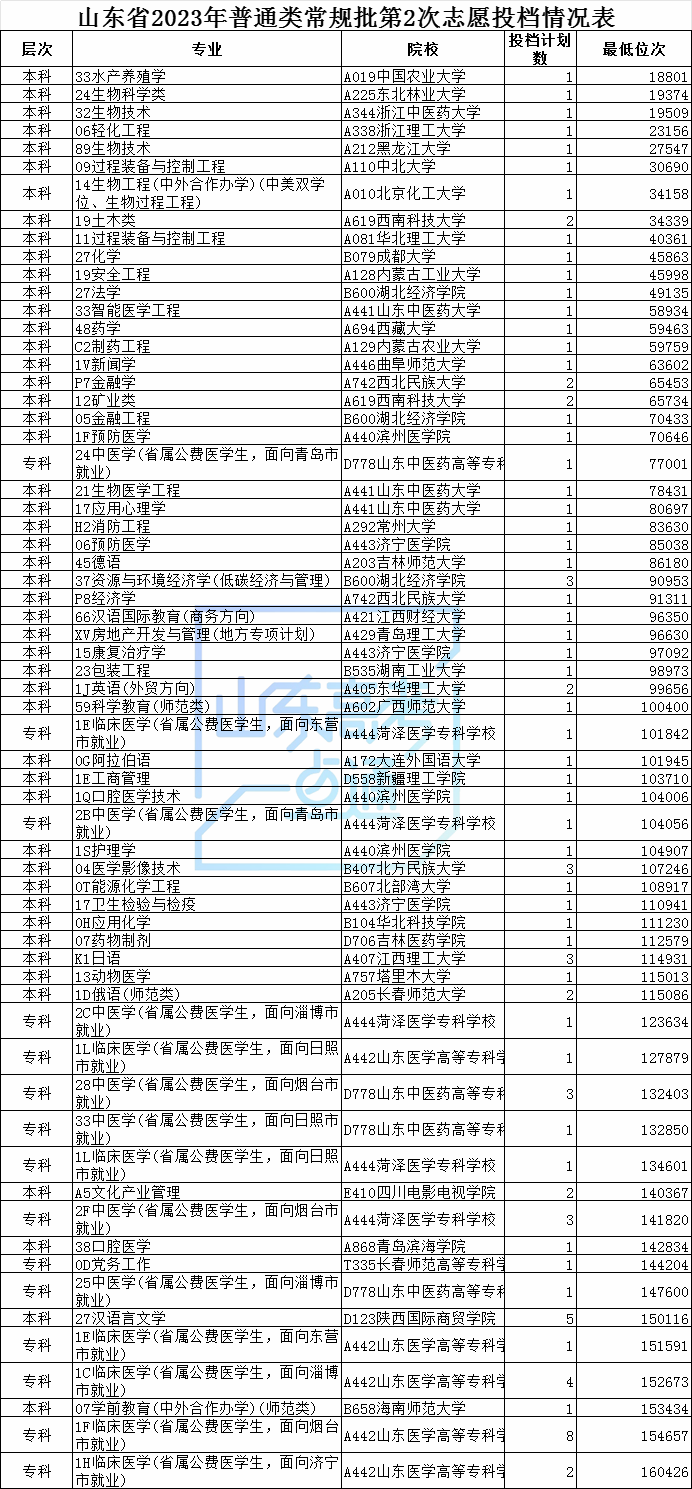 《山东省2023年普通类常规批第2次志愿投档情况表》