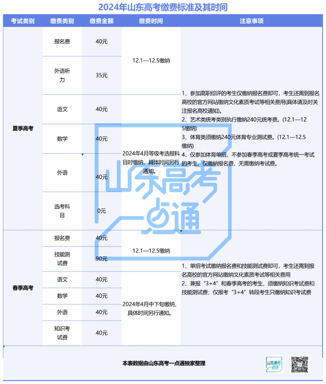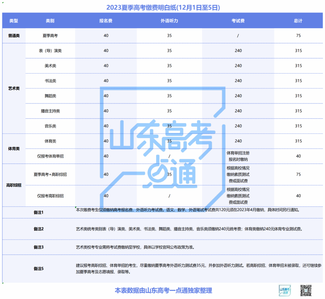夏季高考考试费用包括外语听力、语文、数学、外语笔试考试费。参加夏季高考体育专业测试及美术与设计类、书法类、舞蹈类、音乐类、播音与主持类、表(导)演类等艺术类专业统考的考生,须同时缴纳相应的体育专业测试费及艺术类专业统考费。12月1日—5日(每天9:00—18:00)缴纳报名费、外语听力考试费、体育专业测试费和艺术类专业统考费,其他考试费在等级考试科目选报时一并缴纳。