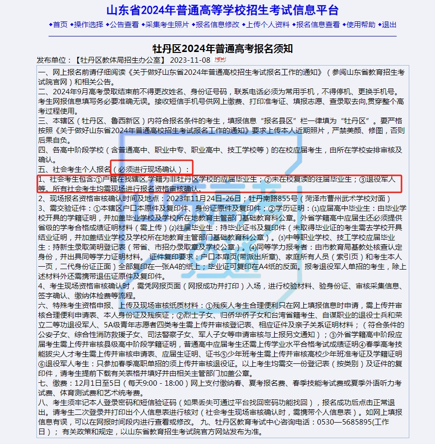 2024年报名实行网上资格审核,内容包括确认身份、审核报考资格等。一般来说,只要考生的资料没有问题,不会再让考生去线下审核的。但是也有例外,如:菏泽牡丹区要求①户籍在该辖区,学籍为非牡丹区学校的应届毕业生;②未在校复读的往届毕业生;③退役军人等必须进行现场确认。