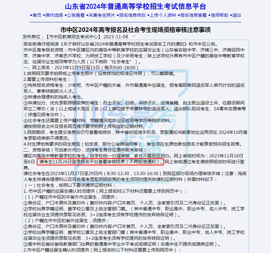 但是,今年也并非所有地区考生都会收到资格审核是否通过的短信,以济南市中区为例,需要考生个人登录报名平台查看审核结果,不再短信通知。