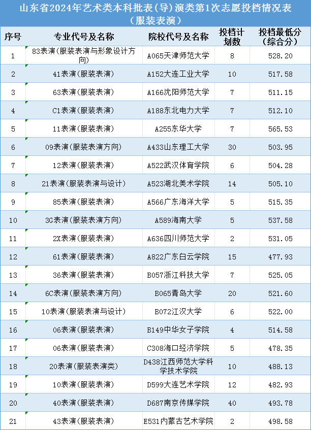 目前,全国有近百所高校开设了服装表演本科专业,包括北京服装学院、东华大学、武汉纺织大学、浙江理工大学、西安工程大学、天津工业大学、天津科技大学、海南大学、海口经济学院、广东工业大学等。2024年在山东省的招生情况如下: