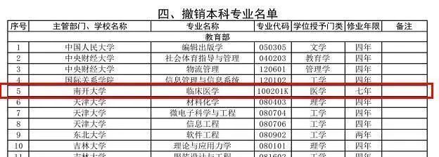 其中,南开大学医学院临床七年制、山东大学齐鲁医学院临床七年制和口腔七年制、中南大学湘雅医学院临床七年制、广西医科大学临床七年制5个专业也在撤销名单中。