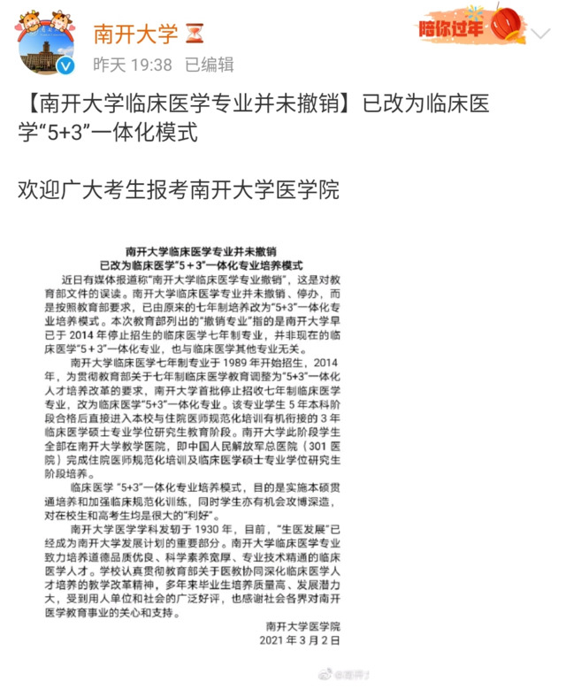 南开大学表示,南开大学临床医学专业并未撤销、停办,而是按照教育部要求,已由原来的七年制培养改为“5+3”一体化专业培养模式。本次教育部列出的“撤销专业”指的是南开大学早已于2014年停止招生的临床医学七年制专业,并非现在的临床医学“5+3”一体化专业,也与临床医学其他专业无关。