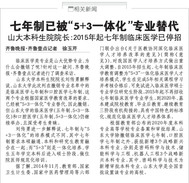 山东大学本科生院院长刘传勇近日接受采访时表示,山东大学此次列在撤销专业名单中的是临床医学七年制和口腔医学七年制,这两个专业根据国家医学教育改革的要求,已经被“5+3一体化”专业替代,因此撤销。但山东大学的临床医学(五年制,5+3一体化)和口腔医学(五年制,5+3一体化)仍继续举办,且深受考生青睐。