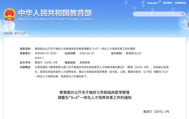 2015年3月,教育部下发《关于做好七年制临床医学教育调整为“5+3”一体化人才培养改革工作的通知》,要求全国各医学院校从2015年起停止招收七年制学生。